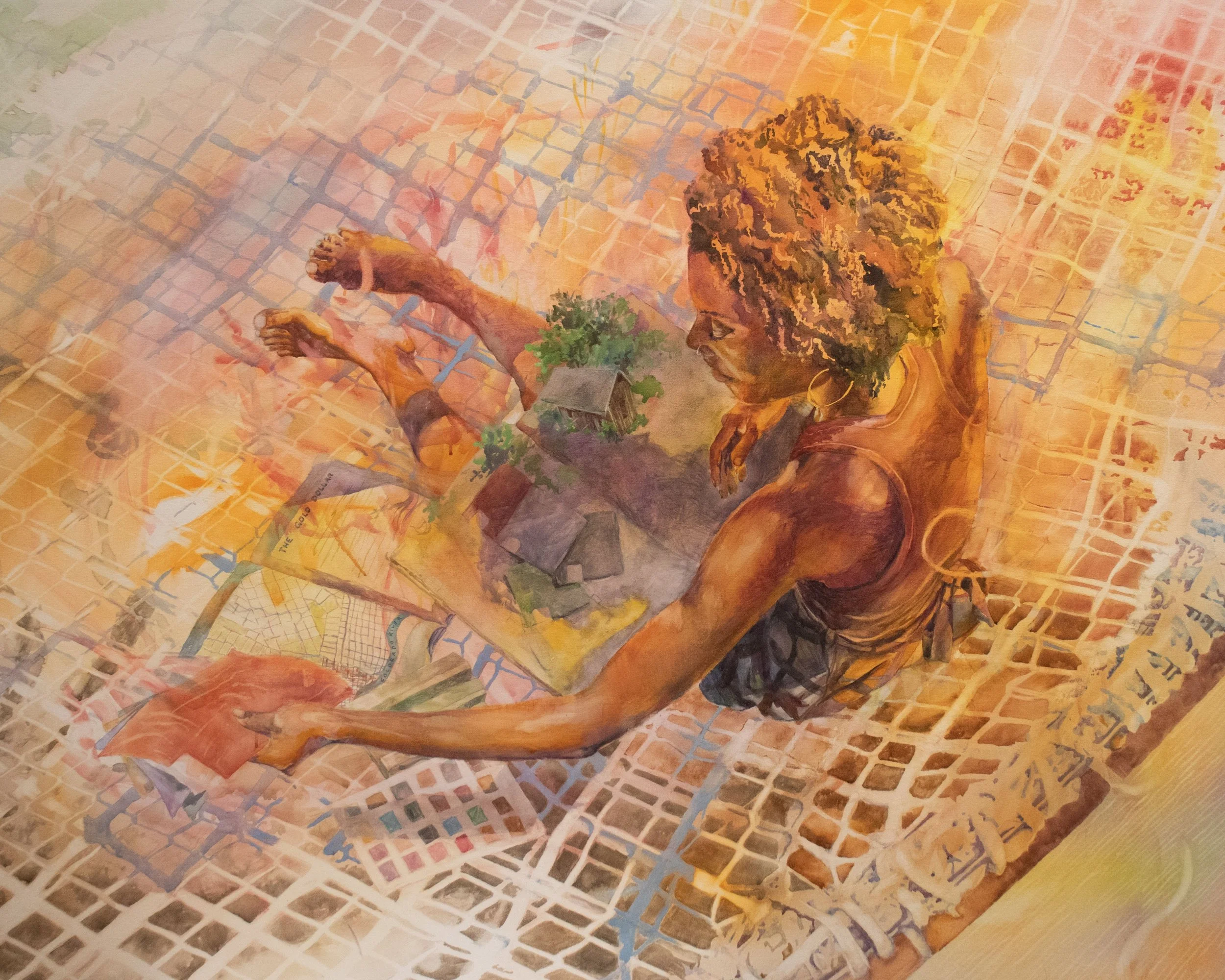 handbuilt life, or remembering something I forgot, watercolor on canvas, 72” x 55”, 2023 designing Pease, watercolor on canvas, 55.5” x 72”, 2023 the white rhino follows, watercolor on canvas, 72” x 55”, 2023